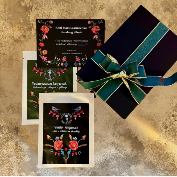Kaunis kinkekarbis ootab kingisaajat kaks mõnusat iluelamust: kinkekaart näohooldusele, mis ühendab põhjamaise looduse väe ja teaduspõhise, rakutasandil toimiva nahauuenduse ning tõhusate toimeainetega kangasmask, mis jätkab naha hellitamist kodus. Kinkekaartide ja kangasmaskide kujundus on loodud armastatud ning andeka disaineri Tanel Veenre poolt. Unimooni mustrid ühendavad tema vaimustuse Eesti rahvuslikest tikanditest tema isiklike mälestustega Eestist.