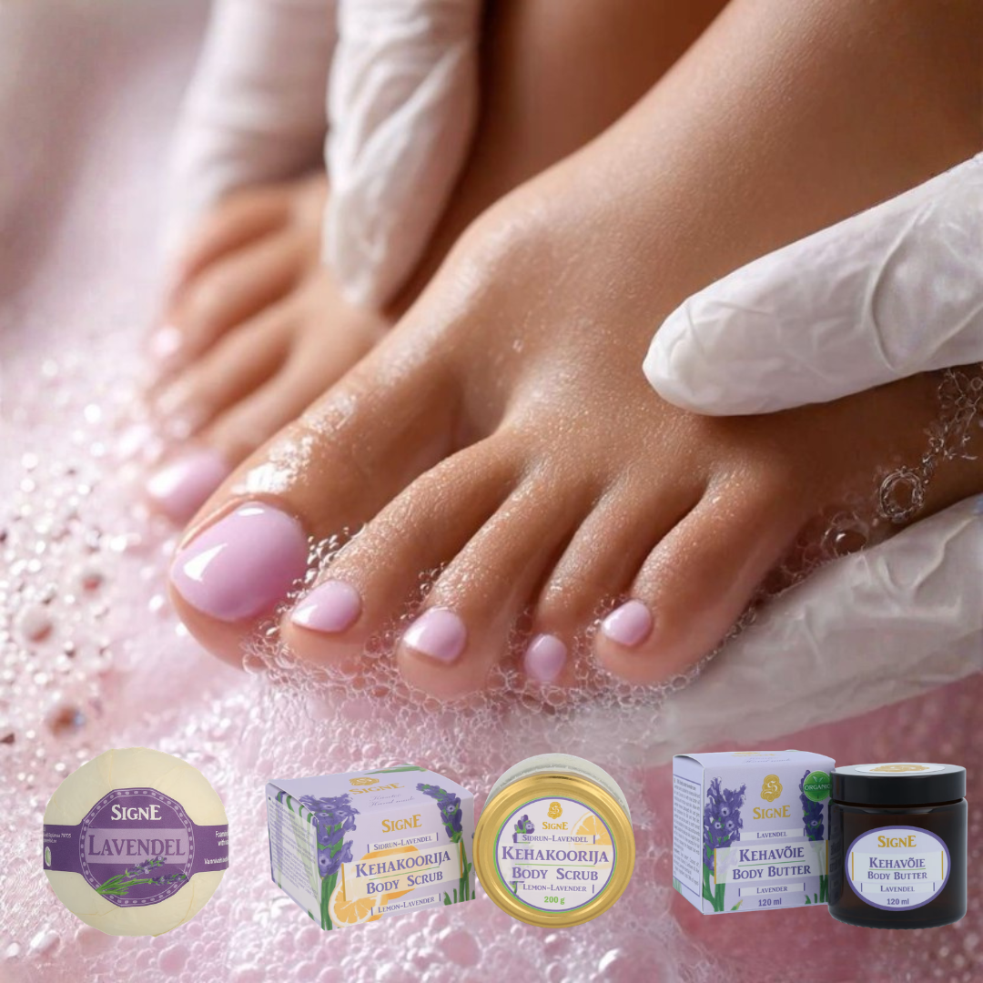 Lavendlit on hinnatud juba sajandeid- nii selle puhta aroomi, värskendava olemuse kui ka rahustava mõju tõttu. Signe Seebid lavendli pediküür algab mõnusa sooja jalavanniga, kus nahka hellitab looduslik Signe Seebid lavendli vannivaht. Järgneb jalgade koorimine suhkru baasil valmistatud Signe Seebid sidruni-lavendli koorijaga, mis eemaldab tõhusalt surnud naharakud, tagab küllusliku niisutuse ning jätab naha siidiselt pehmeks. Seejärel hooldatakse kannad, pöianahad ja tehakse kõik muu pediküüri juurde kuuluv, sealhulgas küünte värvimine kas tavalakiga, geellakiga või ise eemaldatava striplaciga. Protseduuri lõpus viiakse läbi jalatalla massaaž Signe lavendli võidega. Imelise aroomiga kehavõide kookosõli kiire imendumine ja sheavõi sügav niisutus töötavad koos, et pakkuda nahale kõikehõlmavat hooldust. Tulemuseks on hoolitsetud, kaunid ja siidpehmed jalad. Kogu Signe Seebid valmistatud kosmeetika valmib väikeses töökojas käsitööna ja on seetõttu unikaalne. Toodete retseptid on loodud vana Euroopa parimaid praktikaid järgides ning nende lihtsad ja ajatud lõhnakooslused on olnud hinnatud juba aastasadu. Aega tuleks varuda 1,5 h.